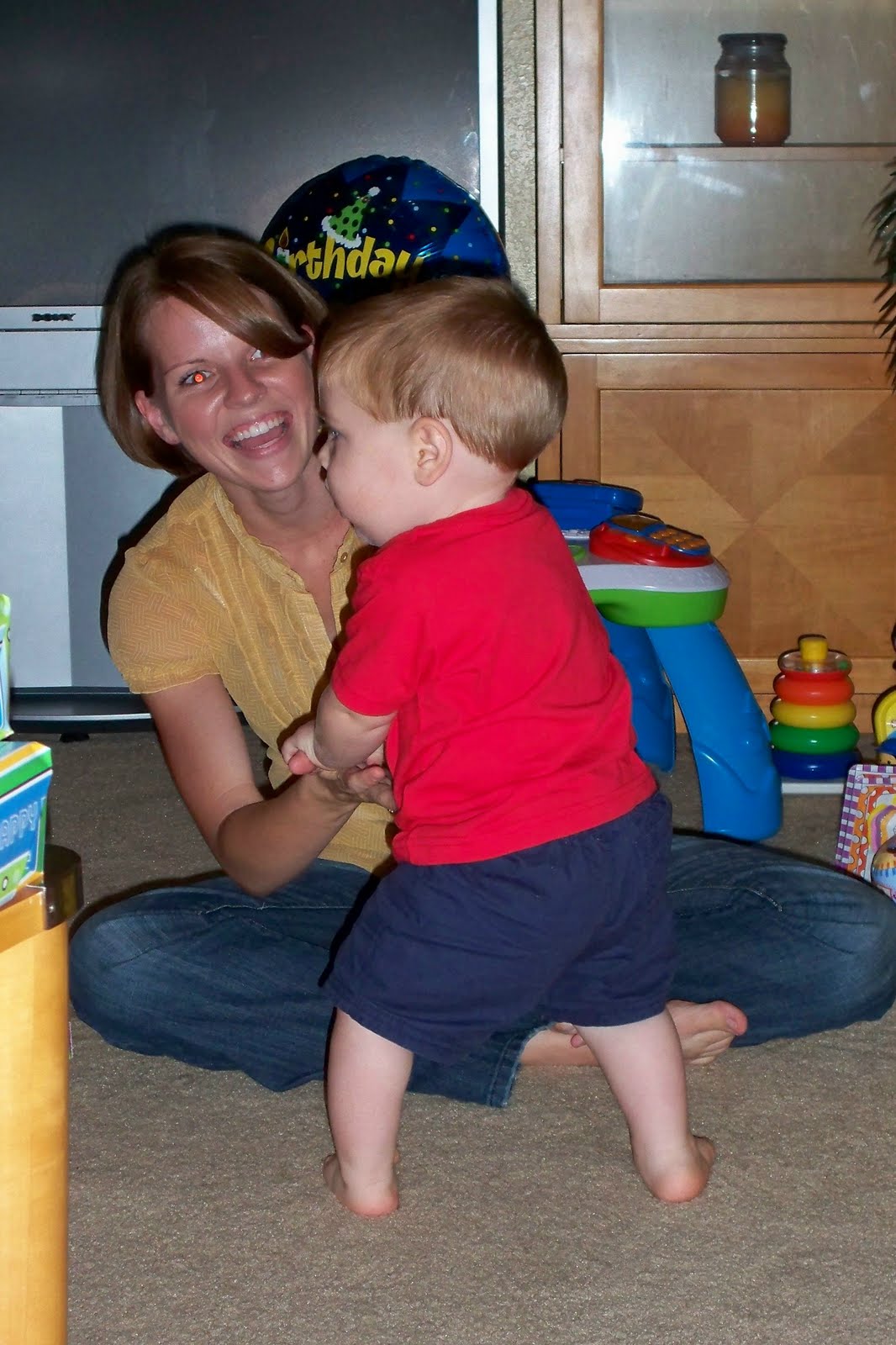 When we got home, we filled up his present from Mom (his water table) and had a blast soaking ourselves and the patio! Connor loves to take steps on the patio, so got a ton of walking practice in. We counted 8 steps as being the longest time he was up and balanced!